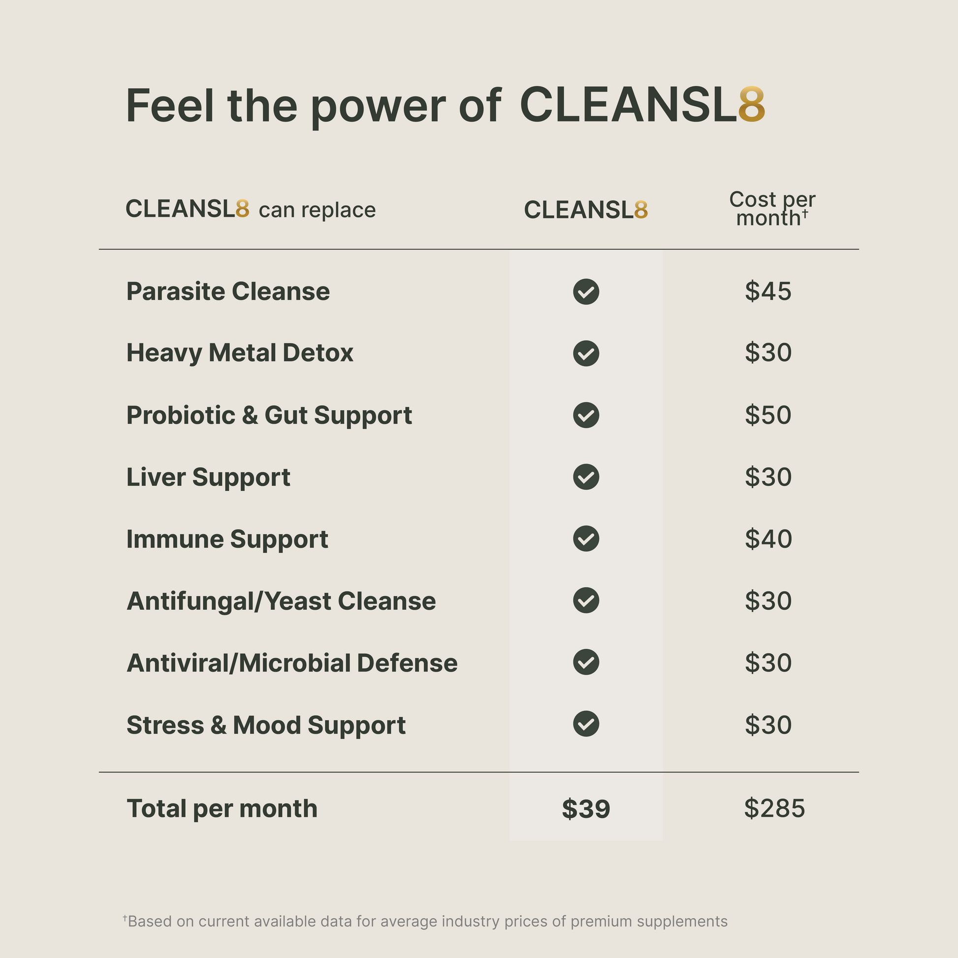 While other products pick one target, CLEANSL8 is designed to go after every invader draining your health — parasites, heavy metals, fungi, toxins, waste, microplastics, and more — in a single, powerful formula.